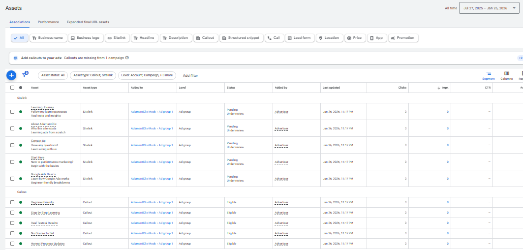 Sitelinks were added to improve ad visibility and make it easier for users to navigate to relevant pages on the website. Each sitelink directs users to specific sections such as the blog and about page, allowing them to choose the content most relevant to their intent. Callouts were also included to reinforce key messaging and better align the ads with what users are searching for. Overall, assets were used to improve clarity, credibility, and user experience while expanding the ad’s presence on the search results page