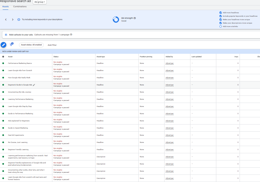 The Ad copy for this mock campaign was written to appeal to beginners interested in learning performance marketing and Google Ads fundamentals. Multiple headlines were created to improve ad strength and give the Responsive Search Ad system more combinations to test. The descriptions focused on highlighting the website as beginner-friendly and easy to understand for users new to digital marketing. Responsive Search Ads were chosen because they automatically test different headline and description combinations to find the best one.